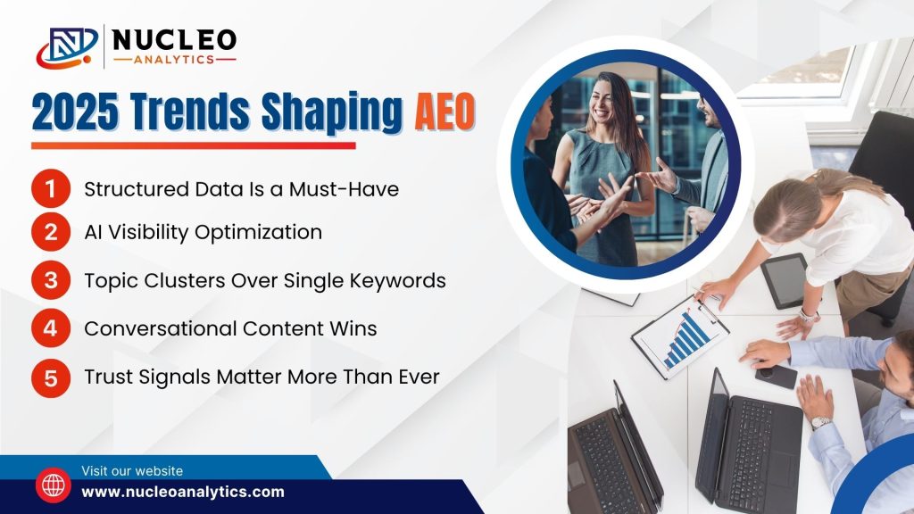 So what’s changing in the world of answer engine optimization this year? Let’s look at the emerging trends in AEO 2025 that every business needs to watch: