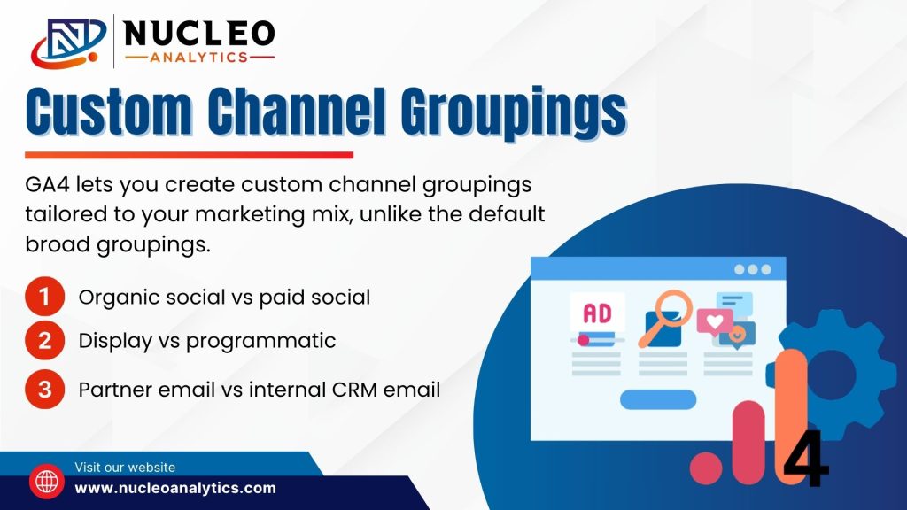 Default channel groupings are too general. GA4 allows you to define custom channel groupings to match your unique marketing mix.