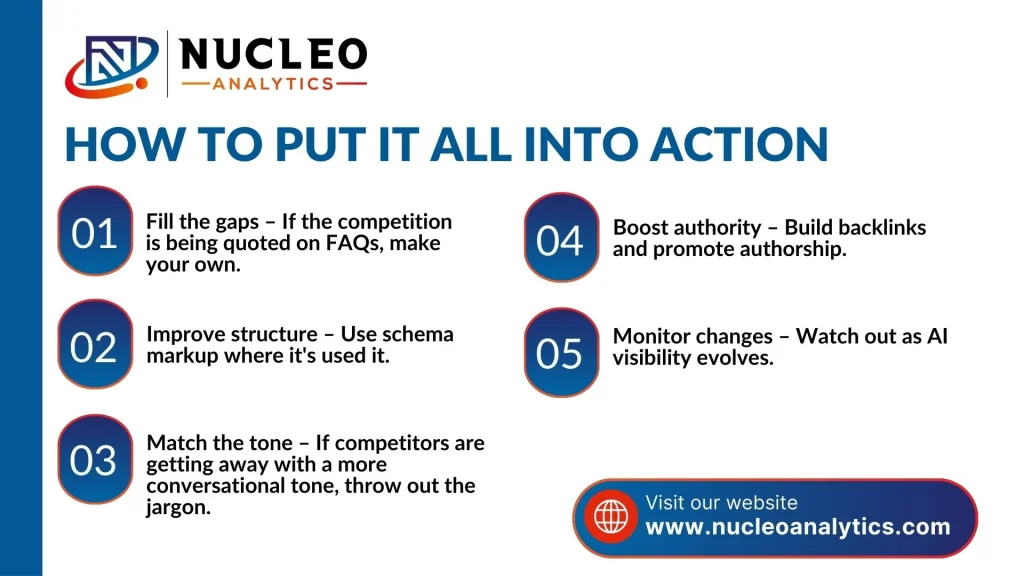 This is the step that most businesses skip. They will do an analysis and then say that it’s done. But AI visibility shifts rapidly.