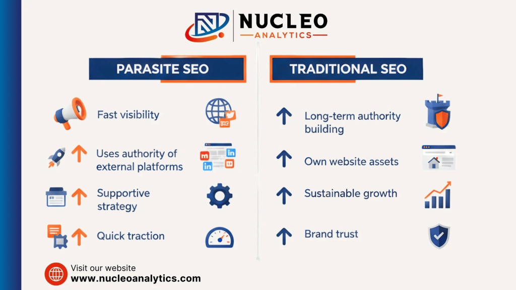 At Nucleo Analytics, parasite SEO is often used to support broader digital marketing goals, not just traffic generation.